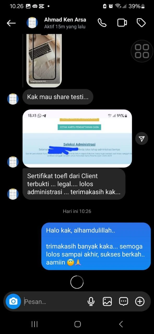 Sertifikat/hasil tes yang berstandar ETS dan diakui Kemenlu, Kemen-BUMN, ESDM dll.